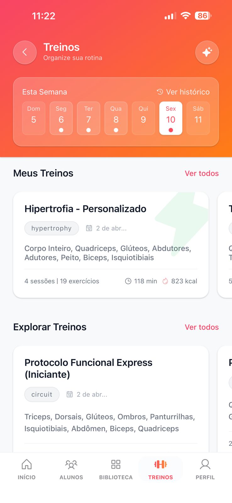 Perfis de profissionais integrados. Receba rotinas estruturadas diretamente do seu educador físico em tempo real.